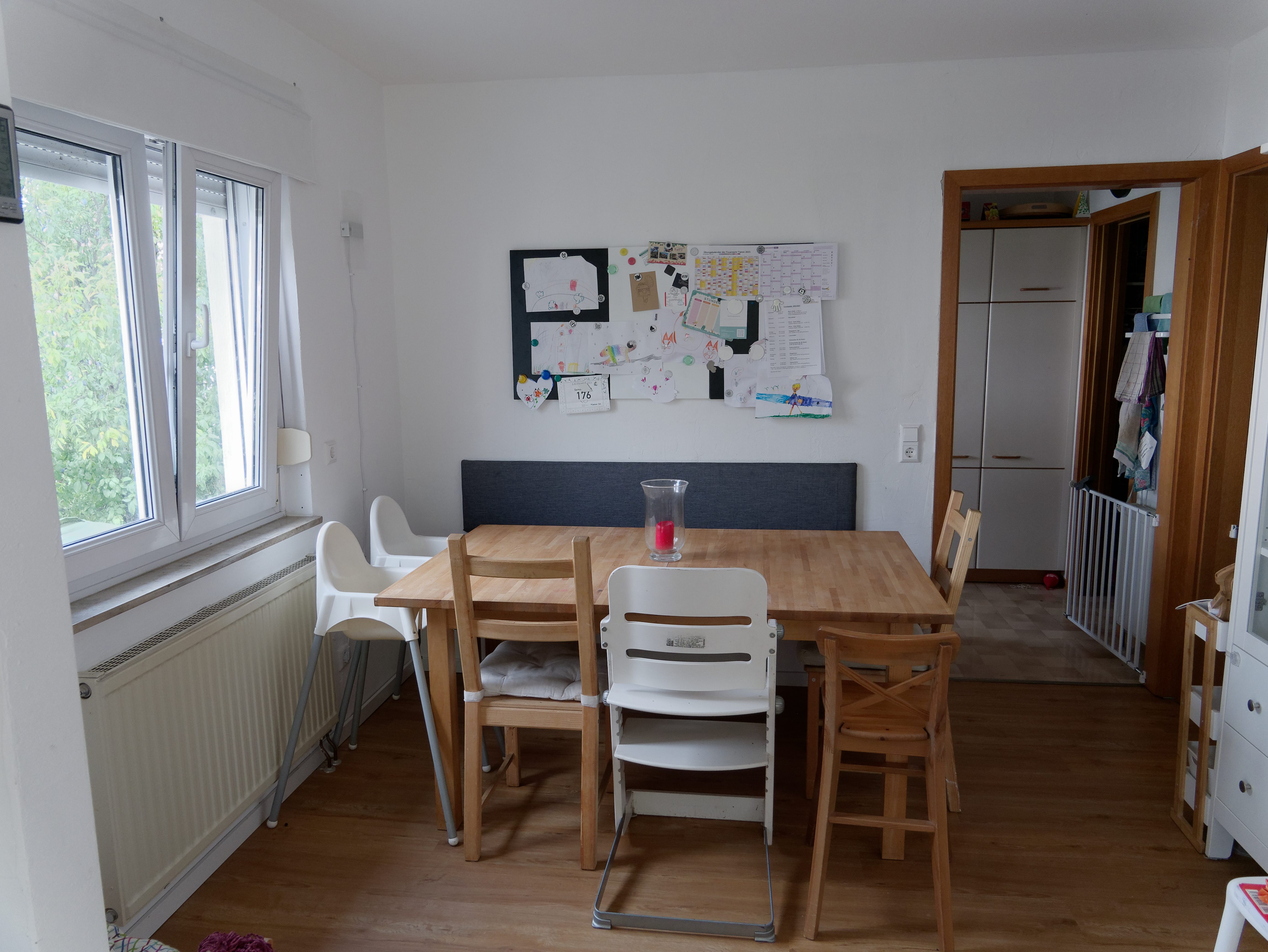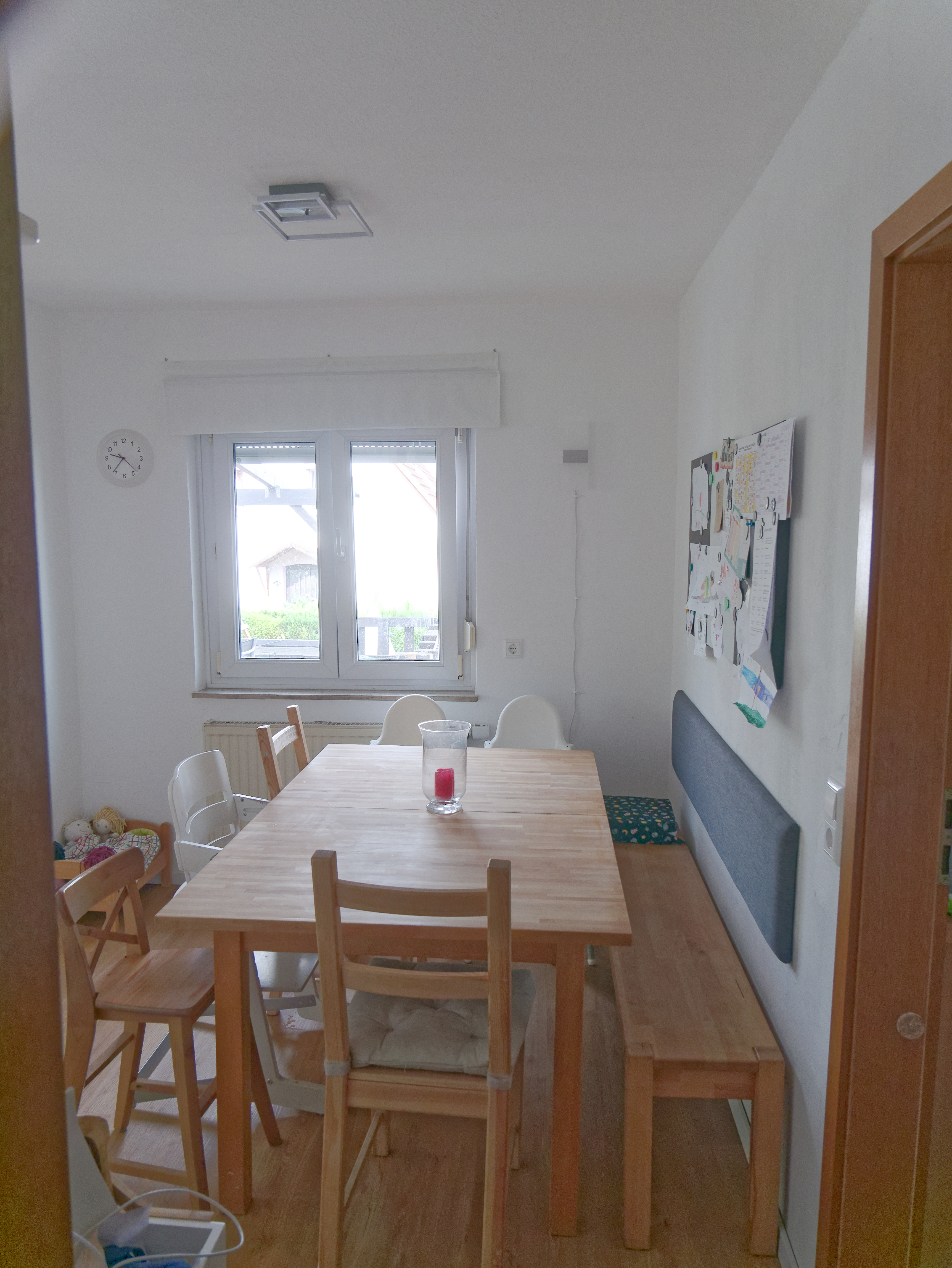 Von der Garderobe aus gelangt man in den Essbereich, der an den Betreuungsraum anschließt. Am großen Tisch besteht für die Kinder jeden Morgen die Möglichkeit zu frühstücken. Hier essen wir gemeinsam zu Mittag und nach dem Mittagsschlaf wird ein kleiner Snack angeboten.