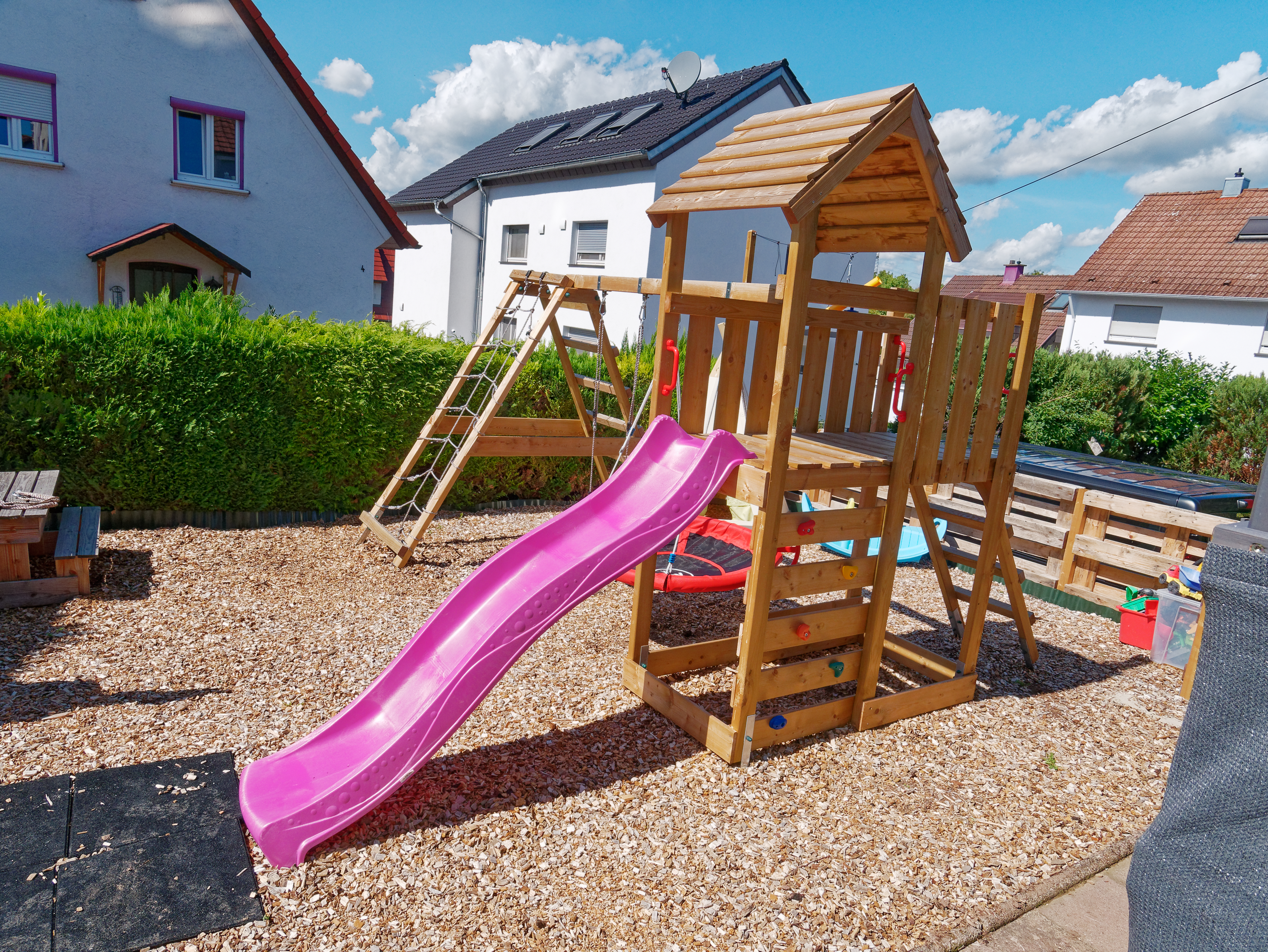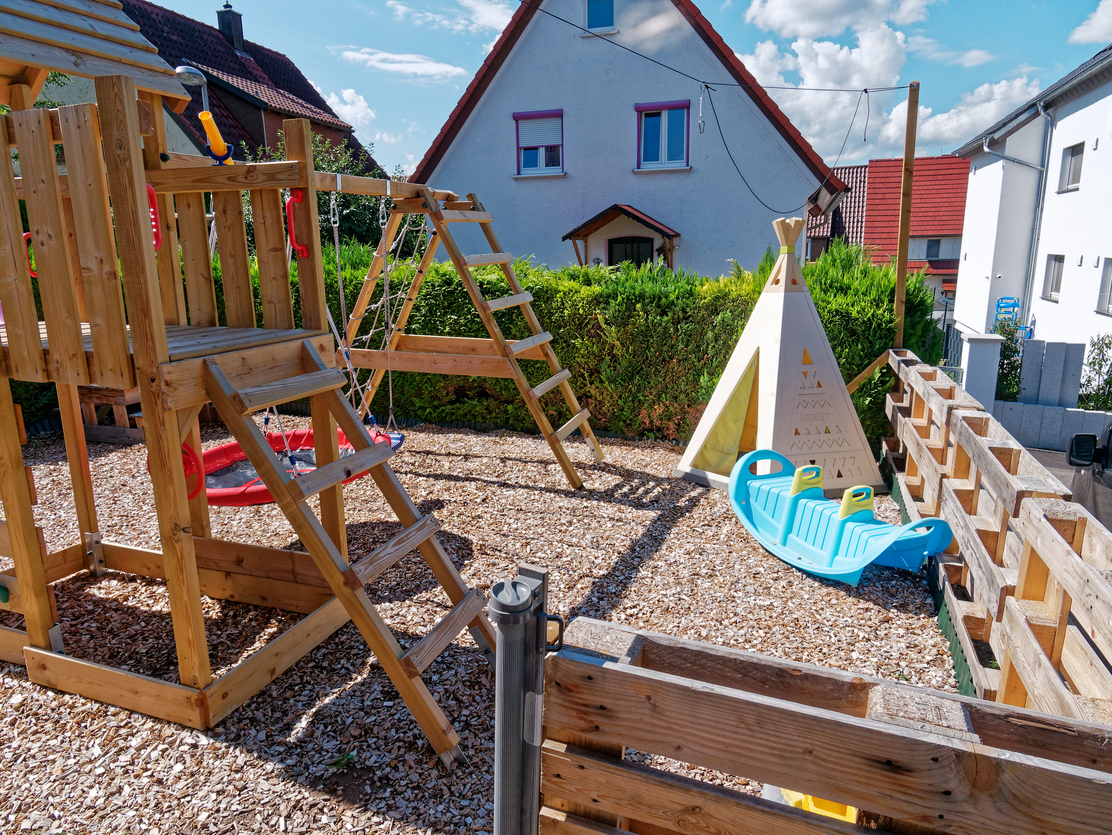 Der Außenbereich ist nocht nicht fertig. Im Garten wird ein großer Spielbereich mit Rutsche, Schaukel, Kletterturm etc. entstehen.